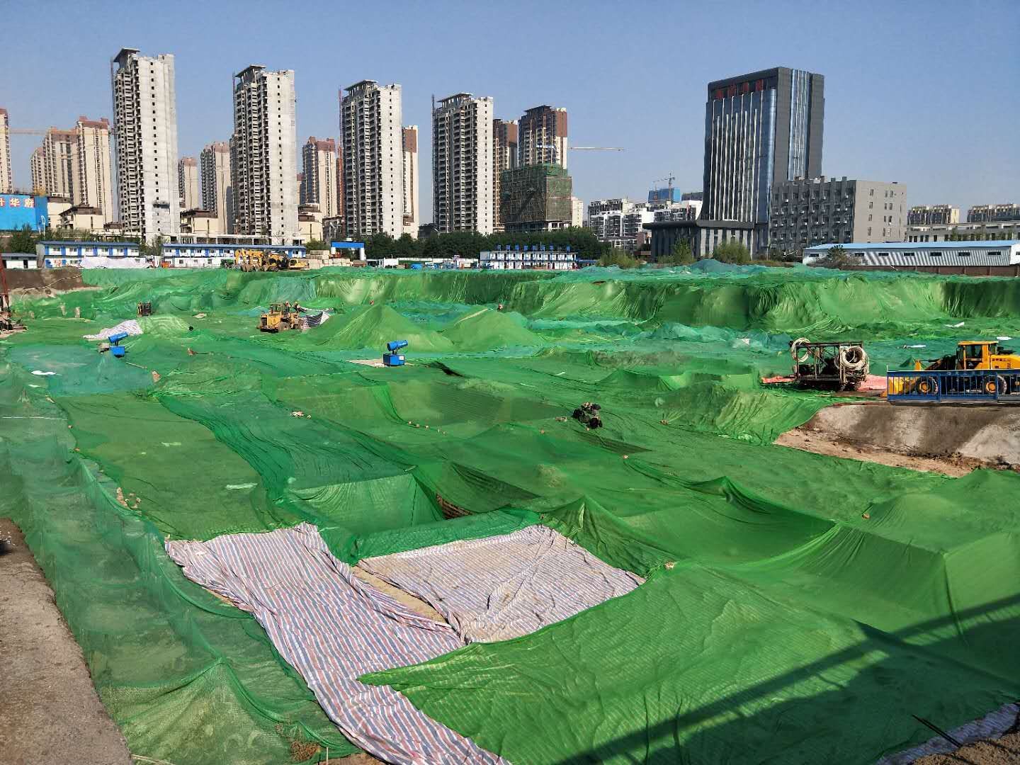 為了控制揚塵,金泰·錦府項目工地配備了齊備的揚塵防治設(shè)施:施工圍擋、清洗設(shè)施、圍擋噴淋,并安裝了聯(lián)網(wǎng)監(jiān)控、號牌識別和道閘等設(shè)施。在工地現(xiàn)場,主干道已經(jīng)完成硬化,往來運輸車輛均需要經(jīng)過沖洗,防止攜帶揚塵;綠色的防塵網(wǎng)鋪陳整齊、潔凈,實現(xiàn)了對建筑材料和土方的全覆蓋;圍擋噴淋裝置每隔一段時間會自行灑水,以達降塵效果。